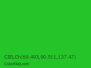 CIELCh 69.493,90.511,137.47 Color is a normal green color and the nearest color is Lime Green #32cd32. Hex code #25c429 and RGB value is rgb(37,196,41). In RGB color space, this color is composed of 15% red, 77% green, 16% blue, In CMYK color space, this color is composed of 81% cyan, 0% magenta, 79% yellow , 23% black , In HSL color space, this color has a hue angle of 122° , 68% saturation and 46% lightness.