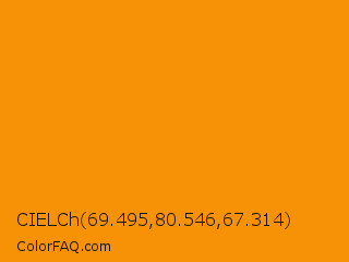 CIELCh 69.495,80.546,67.314 Color is a normal orange color and the nearest color is Orange RYB #fb9902. Hex code #f79105 and RGB value is rgb(247,145,5). In RGB color space, this color is composed of 97% red, 57% green, 2% blue, In CMYK color space, this color is composed of 0% cyan, 41% magenta, 98% yellow , 3% black , In HSL color space, this color has a hue angle of 35° , 96% saturation and 49% lightness.