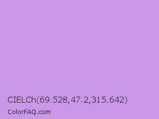 CIELCh 69.528,47.2,315.642 Color is a light purple color and the nearest color is Bright Lavender #bf94e4. Hex code #ca96e6 and RGB value is rgb(202,150,230). In RGB color space, this color is composed of 79% red, 59% green, 90% blue, In CMYK color space, this color is composed of 12% cyan, 35% magenta, 0% yellow , 10% black , In HSL color space, this color has a hue angle of 279° , 62% saturation and 75% lightness.
