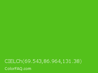 CIELCh 69.543,86.964,131.38 Color is a normal green color and the nearest color is Kelly Green #4cbb17. Hex code #54c11b and RGB value is rgb(84,193,27). In RGB color space, this color is composed of 33% red, 76% green, 11% blue, In CMYK color space, this color is composed of 56% cyan, 0% magenta, 86% yellow , 24% black , In HSL color space, this color has a hue angle of 99° , 75% saturation and 43% lightness.