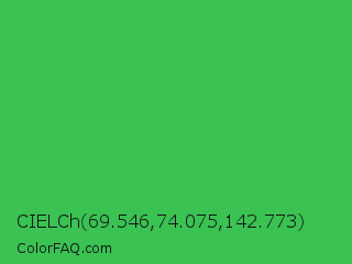 CIELCh 69.546,74.075,142.773 Color is a normal green color and the nearest color is Chateau Green #40a860. Hex code #3ac253 and RGB value is rgb(58,194,83). In RGB color space, this color is composed of 23% red, 76% green, 33% blue, In CMYK color space, this color is composed of 70% cyan, 0% magenta, 57% yellow , 24% black , In HSL color space, this color has a hue angle of 131° , 54% saturation and 49% lightness.