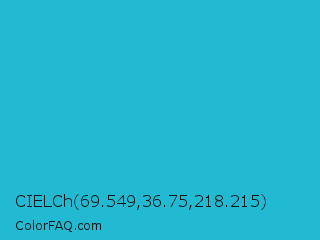 CIELCh 69.549,36.75,218.215 Color is a normal cyan color and the nearest color is Scooter #2ebfd4. Hex code #22bad2 and RGB value is rgb(34,186,210). In RGB color space, this color is composed of 13% red, 73% green, 82% blue, In CMYK color space, this color is composed of 84% cyan, 11% magenta, 0% yellow , 18% black , In HSL color space, this color has a hue angle of 188° , 72% saturation and 48% lightness.