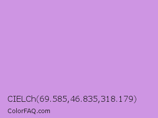 CIELCh 69.585,46.835,318.179 Color is a light purple color and the nearest color is Bright Ube #d19fe8. Hex code #ce95e3 and RGB value is rgb(206,149,227). In RGB color space, this color is composed of 81% red, 58% green, 89% blue, In CMYK color space, this color is composed of 9% cyan, 34% magenta, 0% yellow , 11% black , In HSL color space, this color has a hue angle of 284° , 58% saturation and 74% lightness.