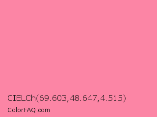 CIELCh 69.603,48.647,4.515 Color is a light rose color and the nearest color is Tickle Me Pink Crayola #fc80a5. Hex code #fc85a5 and RGB value is rgb(252,133,165). In RGB color space, this color is composed of 99% red, 52% green, 65% blue, In CMYK color space, this color is composed of 0% cyan, 47% magenta, 35% yellow , 1% black , In HSL color space, this color has a hue angle of 344° , 95% saturation and 75% lightness.