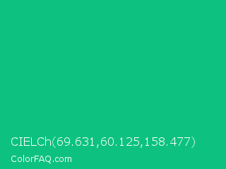 CIELCh 69.631,60.125,158.477 Color is a normal green color and the nearest color is Mountain Meadow Crayola #1ab385. Hex code #0dc280 and RGB value is rgb(13,194,128). In RGB color space, this color is composed of 5% red, 76% green, 50% blue, In CMYK color space, this color is composed of 93% cyan, 0% magenta, 34% yellow , 24% black , In HSL color space, this color has a hue angle of 158° , 87% saturation and 41% lightness.