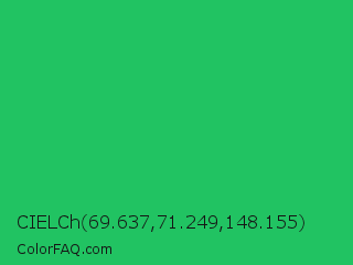 CIELCh 69.637,71.249,148.155 Color is a normal green color and the nearest color is Green Crayola #1cac78. Hex code #21c362 and RGB value is rgb(33,195,98). In RGB color space, this color is composed of 13% red, 76% green, 38% blue, In CMYK color space, this color is composed of 83% cyan, 0% magenta, 50% yellow , 24% black , In HSL color space, this color has a hue angle of 144° , 71% saturation and 45% lightness.