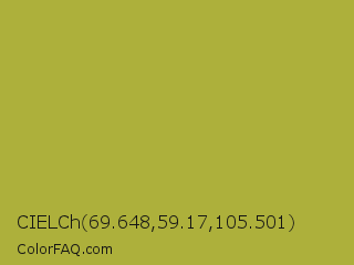 CIELCh 69.648,59.17,105.501 Color is a normal yellow color and the nearest color is Brass #b5a642. Hex code #adb03b and RGB value is rgb(173,176,59). In RGB color space, this color is composed of 68% red, 69% green, 23% blue, In CMYK color space, this color is composed of 2% cyan, 0% magenta, 66% yellow , 31% black , In HSL color space, this color has a hue angle of 62° , 50% saturation and 46% lightness.