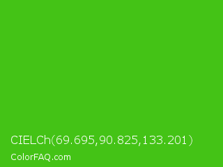 CIELCh 69.695,90.825,133.201 Color is a normal green color and the nearest color is Harlequin Green #46cb18. Hex code #44c316 and RGB value is rgb(68,195,22). In RGB color space, this color is composed of 27% red, 76% green, 9% blue, In CMYK color space, this color is composed of 65% cyan, 0% magenta, 89% yellow , 24% black , In HSL color space, this color has a hue angle of 104° , 80% saturation and 43% lightness.