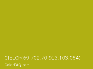 CIELCh 69.702,70.913,103.084 Color is a normal yellow color and the nearest color is Sahara #b7a214. Hex code #b0b013 and RGB value is rgb(176,176,19). In RGB color space, this color is composed of 69% red, 69% green, 7% blue, In CMYK color space, this color is composed of 0% cyan, 0% magenta, 89% yellow , 31% black , In HSL color space, this color has a hue angle of 60° , 81% saturation and 38% lightness.
