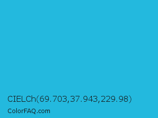 CIELCh 69.703,37.943,229.98 Color is a normal cyan color and the nearest color is Scooter #2ebfd4. Hex code #23b9de and RGB value is rgb(35,185,222). In RGB color space, this color is composed of 14% red, 73% green, 87% blue, In CMYK color space, this color is composed of 84% cyan, 17% magenta, 0% yellow , 13% black , In HSL color space, this color has a hue angle of 192° , 74% saturation and 50% lightness.