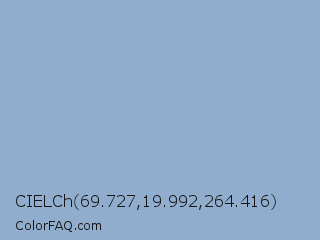 CIELCh 69.727,19.992,264.416 Color is a light blue color and the nearest color is Polo Blue #8da8cc. Hex code #91adce and RGB value is rgb(145,173,206). In RGB color space, this color is composed of 57% red, 68% green, 81% blue, In CMYK color space, this color is composed of 30% cyan, 16% magenta, 0% yellow , 19% black , In HSL color space, this color has a hue angle of 212° , 38% saturation and 69% lightness.
