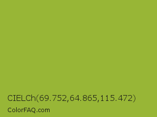 CIELCh 69.752,64.865,115.472 Color is a normal lime color and the nearest color is Android Green #a4c639. Hex code #98b636 and RGB value is rgb(152,182,54). In RGB color space, this color is composed of 60% red, 71% green, 21% blue, In CMYK color space, this color is composed of 16% cyan, 0% magenta, 70% yellow , 29% black , In HSL color space, this color has a hue angle of 74° , 54% saturation and 46% lightness.
