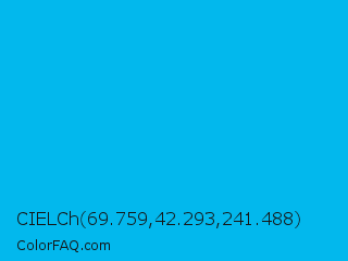CIELCh 69.759,42.293,241.488 Color is a normal blue color and the nearest color is Cyan Process #00b7eb. Hex code #02b8ed and RGB value is rgb(2,184,237). In RGB color space, this color is composed of 1% red, 72% green, 93% blue, In CMYK color space, this color is composed of 99% cyan, 22% magenta, 0% yellow , 7% black , In HSL color space, this color has a hue angle of 194° , 98% saturation and 47% lightness.