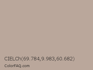 CIELCh 69.784,9.983,60.682 Color is a light orange color and the nearest color is Thatch #b69d98. Hex code #baa79b and RGB value is rgb(186,167,155). In RGB color space, this color is composed of 73% red, 65% green, 61% blue, In CMYK color space, this color is composed of 0% cyan, 10% magenta, 17% yellow , 27% black , In HSL color space, this color has a hue angle of 23° , 18% saturation and 67% lightness.