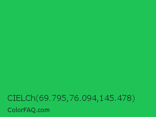 CIELCh 69.795,76.094,145.478 Color is a normal green color and the nearest color is Malachite #0bda51. Hex code #1fc457 and RGB value is rgb(31,196,87). In RGB color space, this color is composed of 12% red, 77% green, 34% blue, In CMYK color space, this color is composed of 84% cyan, 0% magenta, 56% yellow , 23% black , In HSL color space, this color has a hue angle of 140° , 73% saturation and 45% lightness.