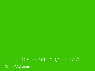 CIELCh 69.79,94.113,133.276 Color is a normal green color and the nearest color is Harlequin Green #46cb18. Hex code #3cc405 and RGB value is rgb(60,196,5). In RGB color space, this color is composed of 24% red, 77% green, 2% blue, In CMYK color space, this color is composed of 69% cyan, 0% magenta, 97% yellow , 23% black , In HSL color space, this color has a hue angle of 103° , 95% saturation and 39% lightness.