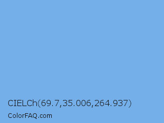 CIELCh 69.7,35.006,264.937 Color is a light blue color and the nearest color is Aero #7cb9e8. Hex code #75afe9 and RGB value is rgb(117,175,233). In RGB color space, this color is composed of 46% red, 69% green, 91% blue, In CMYK color space, this color is composed of 50% cyan, 25% magenta, 0% yellow , 9% black , In HSL color space, this color has a hue angle of 210° , 73% saturation and 69% lightness.