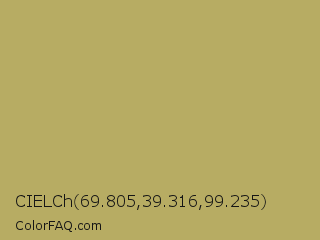 CIELCh 69.805,39.316,99.235 Color is a normal yellow color and the nearest color is Olive Green #b5b35c. Hex code #b7ac63 and RGB value is rgb(183,172,99). In RGB color space, this color is composed of 72% red, 67% green, 39% blue, In CMYK color space, this color is composed of 0% cyan, 6% magenta, 46% yellow , 28% black , In HSL color space, this color has a hue angle of 52° , 37% saturation and 55% lightness.