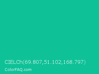 CIELCh 69.807,51.102,168.797 Color is a normal cyan color and the nearest color is Caribbean Green #00cc99. Hex code #0fc197 and RGB value is rgb(15,193,151). In RGB color space, this color is composed of 6% red, 76% green, 59% blue, In CMYK color space, this color is composed of 92% cyan, 0% magenta, 22% yellow , 24% black , In HSL color space, this color has a hue angle of 166° , 86% saturation and 41% lightness.