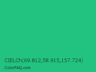 CIELCh 69.812,58.915,157.724 Color is a normal green color and the nearest color is Mountain Meadow Crayola #1ab385. Hex code #22c280 and RGB value is rgb(34,194,128). In RGB color space, this color is composed of 13% red, 76% green, 50% blue, In CMYK color space, this color is composed of 82% cyan, 0% magenta, 34% yellow , 24% black , In HSL color space, this color has a hue angle of 155° , 70% saturation and 45% lightness.