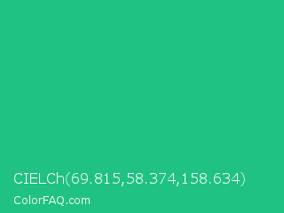 CIELCh 69.815,58.374,158.634 Color is a normal green color and the nearest color is Mountain Meadow Crayola #1ab385. Hex code #1fc282 and RGB value is rgb(31,194,130). In RGB color space, this color is composed of 12% red, 76% green, 51% blue, In CMYK color space, this color is composed of 84% cyan, 0% magenta, 33% yellow , 24% black , In HSL color space, this color has a hue angle of 156° , 72% saturation and 44% lightness.