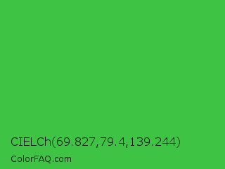 CIELCh 69.827,79.4,139.244 Color is a normal green color and the nearest color is Lime Green #32cd32. Hex code #3fc344 and RGB value is rgb(63,195,68). In RGB color space, this color is composed of 25% red, 76% green, 27% blue, In CMYK color space, this color is composed of 68% cyan, 0% magenta, 65% yellow , 24% black , In HSL color space, this color has a hue angle of 122° , 52% saturation and 51% lightness.