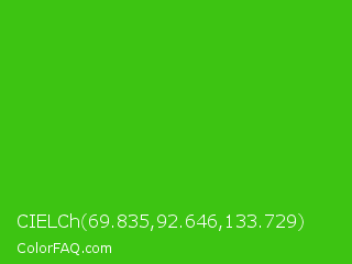 CIELCh 69.835,92.646,133.729 Color is a normal green color and the nearest color is Harlequin Green #46cb18. Hex code #3dc412 and RGB value is rgb(61,196,18). In RGB color space, this color is composed of 24% red, 77% green, 7% blue, In CMYK color space, this color is composed of 69% cyan, 0% magenta, 91% yellow , 23% black , In HSL color space, this color has a hue angle of 106° , 83% saturation and 42% lightness.