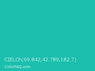 CIELCh 69.842,42.789,182.7 Color is a normal cyan color and the nearest color is Light Sea Green #20b2aa. Hex code #1cbfad and RGB value is rgb(28,191,173). In RGB color space, this color is composed of 11% red, 75% green, 68% blue, In CMYK color space, this color is composed of 85% cyan, 0% magenta, 9% yellow , 25% black , In HSL color space, this color has a hue angle of 173° , 74% saturation and 43% lightness.