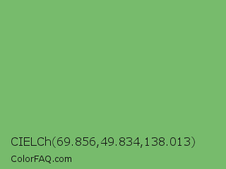 CIELCh 69.856,49.834,138.013 Color is a normal green color and the nearest color is Mantis #74c365. Hex code #77bb6c and RGB value is rgb(119,187,108). In RGB color space, this color is composed of 47% red, 73% green, 42% blue, In CMYK color space, this color is composed of 36% cyan, 0% magenta, 42% yellow , 27% black , In HSL color space, this color has a hue angle of 112° , 37% saturation and 58% lightness.