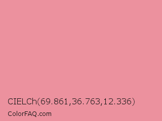 CIELCh 69.861,36.763,12.336 Color is a light red color and the nearest color is Sea Pink #ed989e. Hex code #ec919e and RGB value is rgb(236,145,158). In RGB color space, this color is composed of 93% red, 57% green, 62% blue, In CMYK color space, this color is composed of 0% cyan, 39% magenta, 33% yellow , 7% black , In HSL color space, this color has a hue angle of 351° , 71% saturation and 75% lightness.