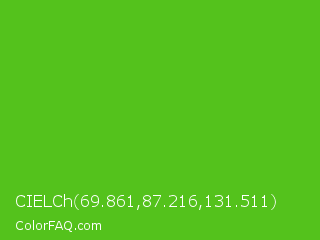 CIELCh 69.861,87.216,131.511 Color is a normal green color and the nearest color is Kelly Green #4cbb17. Hex code #54c21c and RGB value is rgb(84,194,28). In RGB color space, this color is composed of 33% red, 76% green, 11% blue, In CMYK color space, this color is composed of 57% cyan, 0% magenta, 86% yellow , 24% black , In HSL color space, this color has a hue angle of 100° , 75% saturation and 44% lightness.