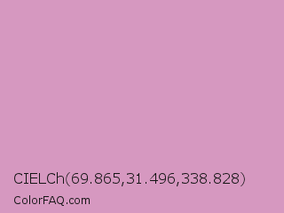 CIELCh 69.865,31.496,338.828 Color is a light magenta color and the nearest color is Light Medium Orchid #d39bcb. Hex code #d698c0 and RGB value is rgb(214,152,192). In RGB color space, this color is composed of 84% red, 60% green, 75% blue, In CMYK color space, this color is composed of 0% cyan, 29% magenta, 10% yellow , 16% black , In HSL color space, this color has a hue angle of 321° , 43% saturation and 72% lightness.