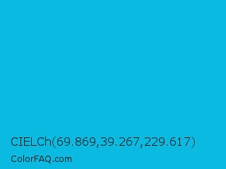 CIELCh 69.869,39.267,229.617 Color is a normal cyan color and the nearest color is Cyan Process #00b7eb. Hex code #0abae0 and RGB value is rgb(10,186,224). In RGB color space, this color is composed of 4% red, 73% green, 88% blue, In CMYK color space, this color is composed of 96% cyan, 17% magenta, 0% yellow , 12% black , In HSL color space, this color has a hue angle of 191° , 91% saturation and 46% lightness.