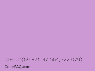 CIELCh 69.871,37.564,322.079 Color is a light magenta color and the nearest color is Light Grayish Magenta #cc99cc. Hex code #cd99d5 and RGB value is rgb(205,153,213). In RGB color space, this color is composed of 80% red, 60% green, 84% blue, In CMYK color space, this color is composed of 4% cyan, 28% magenta, 0% yellow , 16% black , In HSL color space, this color has a hue angle of 292° , 42% saturation and 72% lightness.