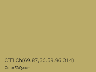 CIELCh 69.87,36.59,96.314 Color is a normal yellow color and the nearest color is Gimblet #b8b56a. Hex code #baab68 and RGB value is rgb(186,171,104). In RGB color space, this color is composed of 73% red, 67% green, 41% blue, In CMYK color space, this color is composed of 0% cyan, 8% magenta, 44% yellow , 27% black , In HSL color space, this color has a hue angle of 49° , 37% saturation and 57% lightness.