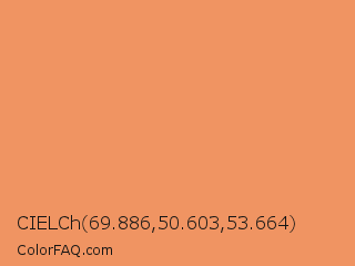 CIELCh 69.886,50.603,53.664 Color is a light orange color and the nearest color is Big Foot Feet #e88e5a. Hex code #f09462 and RGB value is rgb(240,148,98). In RGB color space, this color is composed of 94% red, 58% green, 38% blue, In CMYK color space, this color is composed of 0% cyan, 38% magenta, 59% yellow , 6% black , In HSL color space, this color has a hue angle of 21° , 83% saturation and 66% lightness.