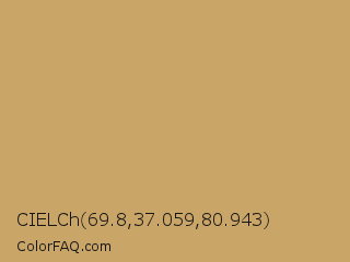 CIELCh 69.8,37.059,80.943 Color is a normal orange color and the nearest color is Brown Yellow #cc9966. Hex code #caa568 and RGB value is rgb(202,165,104). In RGB color space, this color is composed of 79% red, 65% green, 41% blue, In CMYK color space, this color is composed of 0% cyan, 18% magenta, 49% yellow , 21% black , In HSL color space, this color has a hue angle of 37° , 48% saturation and 60% lightness.