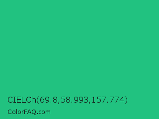 CIELCh 69.8,58.993,157.774 Color is a normal green color and the nearest color is Mountain Meadow Crayola #1ab385. Hex code #21c280 and RGB value is rgb(33,194,128). In RGB color space, this color is composed of 13% red, 76% green, 50% blue, In CMYK color space, this color is composed of 83% cyan, 0% magenta, 34% yellow , 24% black , In HSL color space, this color has a hue angle of 155° , 71% saturation and 45% lightness.