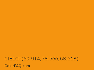 CIELCh 69.914,78.566,68.518 Color is a normal orange color and the nearest color is West Side #ff910f. Hex code #f5940f and RGB value is rgb(245,148,15). In RGB color space, this color is composed of 96% red, 58% green, 6% blue, In CMYK color space, this color is composed of 0% cyan, 40% magenta, 94% yellow , 4% black , In HSL color space, this color has a hue angle of 35° , 92% saturation and 51% lightness.