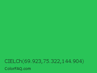 CIELCh 69.923,75.322,144.904 Color is a normal green color and the nearest color is UFO Green #3cd070. Hex code #29c457 and RGB value is rgb(41,196,87). In RGB color space, this color is composed of 16% red, 77% green, 34% blue, In CMYK color space, this color is composed of 79% cyan, 0% magenta, 56% yellow , 23% black , In HSL color space, this color has a hue angle of 138° , 65% saturation and 46% lightness.