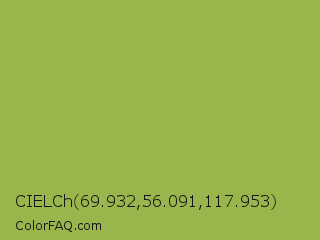 CIELCh 69.932,56.091,117.953 Color is a normal lime color and the nearest color is Android Green #a4c639. Hex code #98b64c and RGB value is rgb(152,182,76). In RGB color space, this color is composed of 60% red, 71% green, 30% blue, In CMYK color space, this color is composed of 16% cyan, 0% magenta, 58% yellow , 29% black , In HSL color space, this color has a hue angle of 77° , 42% saturation and 51% lightness.