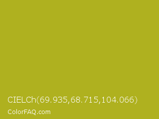 CIELCh 69.935,68.715,104.066 Color is a normal yellow color and the nearest color is Acid Green #b0bf1a. Hex code #afb11f and RGB value is rgb(175,177,31). In RGB color space, this color is composed of 69% red, 69% green, 12% blue, In CMYK color space, this color is composed of 1% cyan, 0% magenta, 82% yellow , 31% black , In HSL color space, this color has a hue angle of 61° , 70% saturation and 41% lightness.