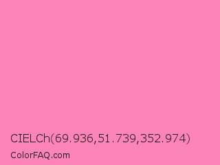 CIELCh 69.936,51.739,352.974 Color is a light rose color and the nearest color is Persian Pink #f77fbe. Hex code #fc84b8 and RGB value is rgb(252,132,184). In RGB color space, this color is composed of 99% red, 52% green, 72% blue, In CMYK color space, this color is composed of 0% cyan, 48% magenta, 27% yellow , 1% black , In HSL color space, this color has a hue angle of 334° , 95% saturation and 75% lightness.