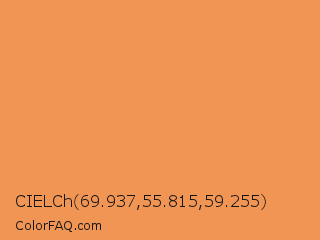 CIELCh 69.937,55.815,59.255 Color is a light orange color and the nearest color is Big Foot Feet #e88e5a. Hex code #f09554 and RGB value is rgb(240,149,84). In RGB color space, this color is composed of 94% red, 58% green, 33% blue, In CMYK color space, this color is composed of 0% cyan, 38% magenta, 65% yellow , 6% black , In HSL color space, this color has a hue angle of 25° , 84% saturation and 64% lightness.