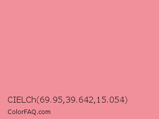 CIELCh 69.95,39.642,15.054 Color is a light red color and the nearest color is Sea Pink #ed989e. Hex code #f18f9a and RGB value is rgb(241,143,154). In RGB color space, this color is composed of 95% red, 56% green, 60% blue, In CMYK color space, this color is composed of 0% cyan, 41% magenta, 36% yellow , 5% black , In HSL color space, this color has a hue angle of 353° , 78% saturation and 75% lightness.