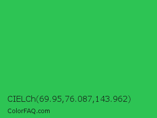 CIELCh 69.95,76.087,143.962 Color is a normal green color and the nearest color is UFO Green #3cd070. Hex code #2dc454 and RGB value is rgb(45,196,84). In RGB color space, this color is composed of 18% red, 77% green, 33% blue, In CMYK color space, this color is composed of 77% cyan, 0% magenta, 57% yellow , 23% black , In HSL color space, this color has a hue angle of 135° , 63% saturation and 47% lightness.