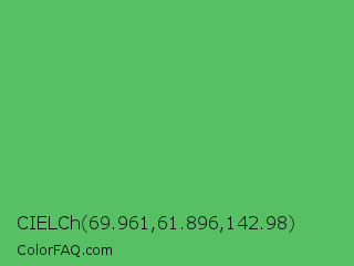 CIELCh 69.961,61.896,142.98 Color is a normal green color and the nearest color is Fern #63b76c. Hex code #58c064 and RGB value is rgb(88,192,100). In RGB color space, this color is composed of 35% red, 75% green, 39% blue, In CMYK color space, this color is composed of 54% cyan, 0% magenta, 48% yellow , 25% black , In HSL color space, this color has a hue angle of 127° , 45% saturation and 55% lightness.