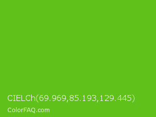 CIELCh 69.969,85.193,129.445 Color is a normal green color and the nearest color is Kelly Green #4cbb17. Hex code #60c11b and RGB value is rgb(96,193,27). In RGB color space, this color is composed of 38% red, 76% green, 11% blue, In CMYK color space, this color is composed of 50% cyan, 0% magenta, 86% yellow , 24% black , In HSL color space, this color has a hue angle of 95° , 75% saturation and 43% lightness.