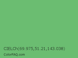 CIELCh 69.975,51.21,143.038 Color is a normal green color and the nearest color is Iguana Green #71bc78. Hex code #6bbd71 and RGB value is rgb(107,189,113). In RGB color space, this color is composed of 42% red, 74% green, 44% blue, In CMYK color space, this color is composed of 43% cyan, 0% magenta, 40% yellow , 26% black , In HSL color space, this color has a hue angle of 124° , 38% saturation and 58% lightness.