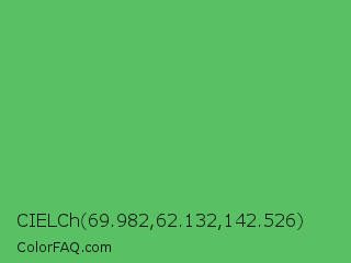 CIELCh 69.982,62.132,142.526 Color is a normal green color and the nearest color is Fern #63b76c. Hex code #59c063 and RGB value is rgb(89,192,99). In RGB color space, this color is composed of 35% red, 75% green, 39% blue, In CMYK color space, this color is composed of 54% cyan, 0% magenta, 48% yellow , 25% black , In HSL color space, this color has a hue angle of 126° , 45% saturation and 55% lightness.